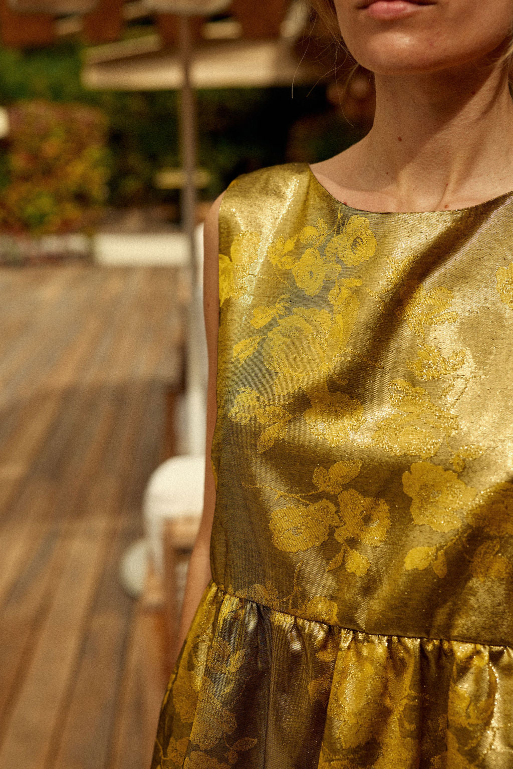Avec son décolleté plongeant dans le dos et sa basque froncée, le haut AZYLIS est romantique et sensuel. Confectionné dans un brocard bronze et doré, il se porte amplement.
